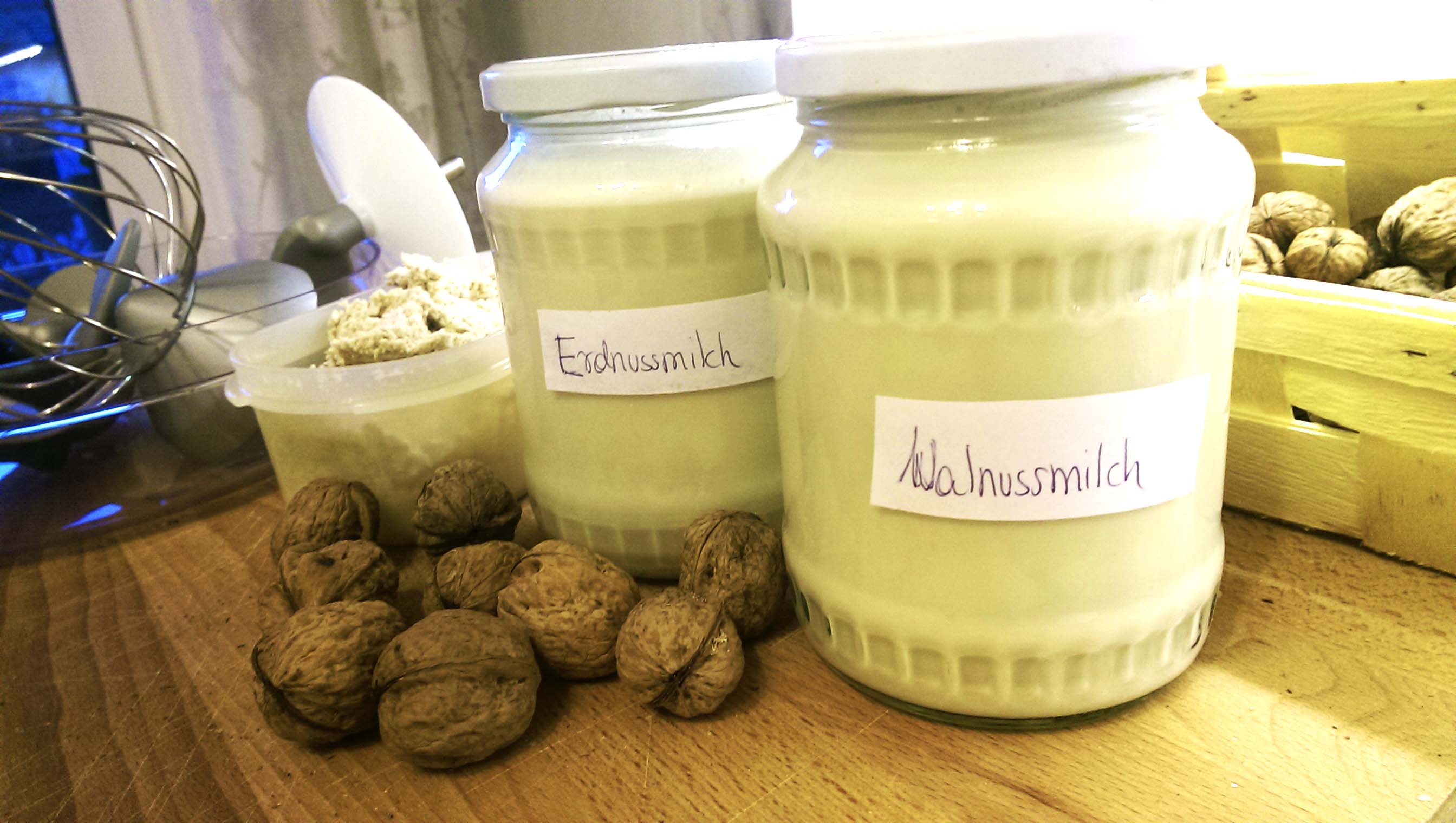 Man nehme Nüsse (Mandel, Erdnüsse, Walnüsse oder was auch immer man gerne hat) und weicht diese ein. (Ich bin ein sehr ungeduldiges Ninchen und habs daher nur etwa 2-3h eingeweicht, die Erdnüsse überhaupt nicht.) Ist die Wartezeit endlich vorbei nimmt man die Nüsse und schüttet sie nach und nach mit etwas Wasser in den Mixer. (Bei den Walnüssen hab ich das Einweichwasser, auf Grund der Vermutung dass Bitterstoffe ausgewaschen wurden, weggeschüttet.) Tja und dann wird so lange gemixt und Wasser zugegeben bis die gewünschte Konsistenz erreicht ist. Bei ca.150g Nüssen hab ich einen Liter Wasser benützt. Hat man´s gerne etwas süßer gibt man noch Zucker, Xylit, Stevia oder Datteln dazu. Zu guter letzt- wenn die Milch die Geschmacksprobe bestanden hat- wird abgeseiht. Hier zu benützt man entweder ein sehr feines Sieb oder eben ein Küchentuch/Passiertuch.
