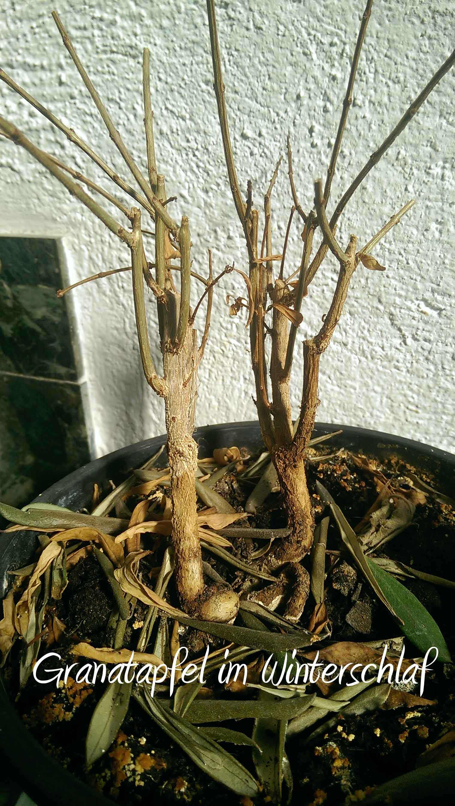 • Granatapfel. Boah ja.. der hat mich ziemlich genervt. Er lebt noch- glaub ich zumindest (im Moment ist er im Winterschlaf und hat keine Blätter) aber der liebe Granatapfel ist eher buschartig und schnell sehr hoch gewachsen und darum immer umgefallen. Ich hab ihn 3-4mal aus Verzweiflung einfach zusammengeschnitten und bis zur Hälfte eingekürzt. Mittlerweile sieht er schon fast aus wie ein kleiner Baum. Aber so richtig gut gehts ihm glaub ich nicht. Hatte ihn letztes Jahr falsch überwintert. Heuer steht er so wies gehört in einem eher kühlen hellen Raum und nicht mehr direkt über der Heizung … :-/