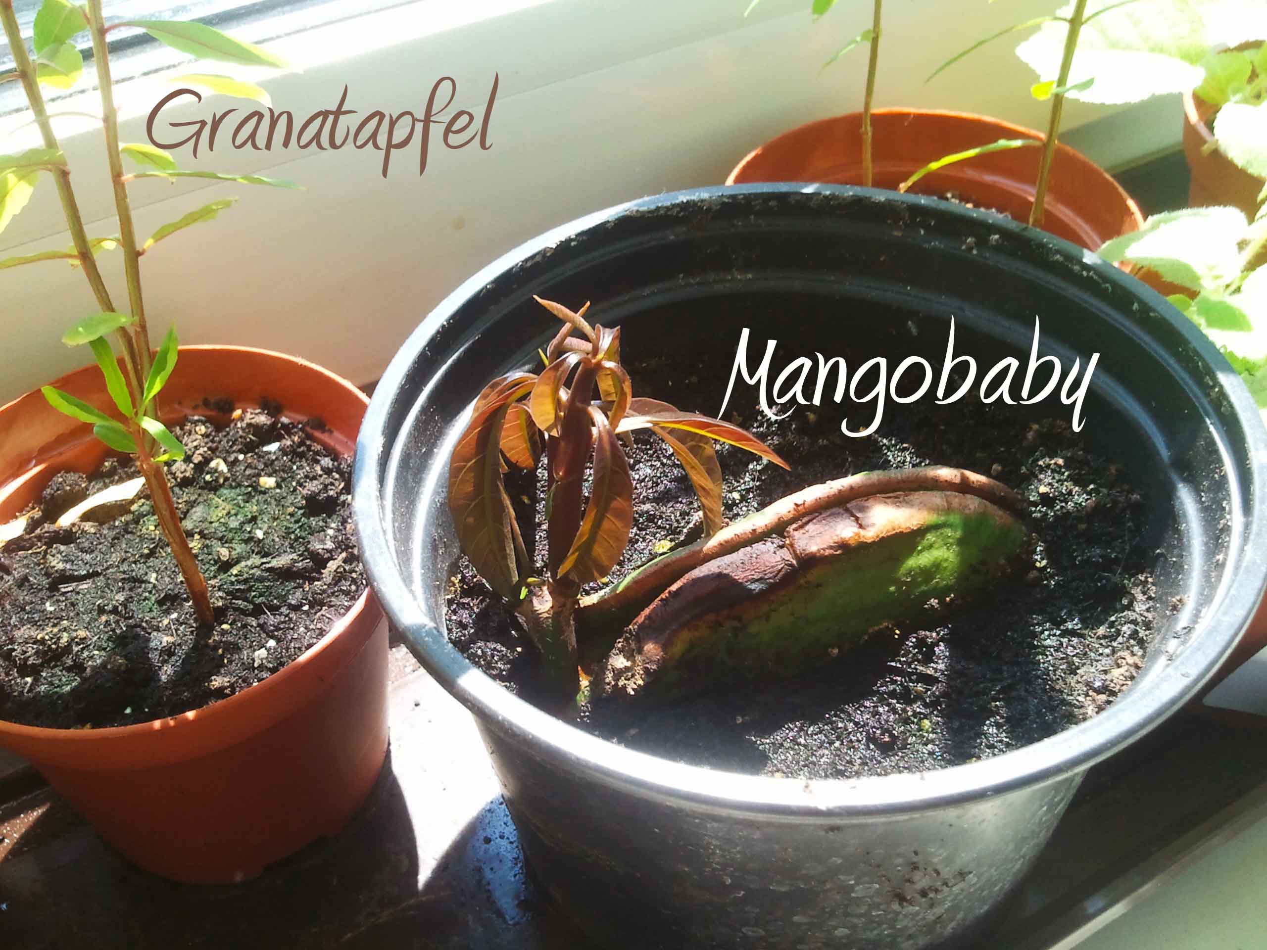 Es war im Februar vor ca. 3 Jahren. Mit war STINKE langweilig und ich hatte einen unbändigen Drang nach frischem Grün in der Wohnung. Ich stand in der Küche vor meinem prall gefüllten Obstkorb in dem ein Granatapfel, Mango, Litschi und getrocknete Datteln lagen und entschied mich den Versuch zu starten ob sie austreiben würden wenn ich die Kerne einsetze. Gesagt getan, am Abend gabs Mango, Granatapfel und Litschi zu essen und als Nachspeise Datteln. Die schönsten Kerne von Litschi, Dattel und Granatapfel legte ich beiseite. Den Mango Kern hab ich abgewaschen und dann vorsichtig aufgeschnitten. Hier muss man wirklich gut auf seine Finger aufpassen. Ich war hin und weg. Mango Kerne sind so was schönes! Leider hab ich kein Foto gemacht, aber der Kern sah aus wie eine riesige Bohne mit wunderschöner Zeichnung in weiß und verschiedenen Brauntönen. Den Kern hab ich senkrecht in die Erde gesetzt sodass der Kern erst ab der Häfte aus der Erde schaute. Im Internet gabs diverse Varianten mit liegend oder ganz eingegraben, aber ich hab mich für die senkrecht stehende entschieden.
