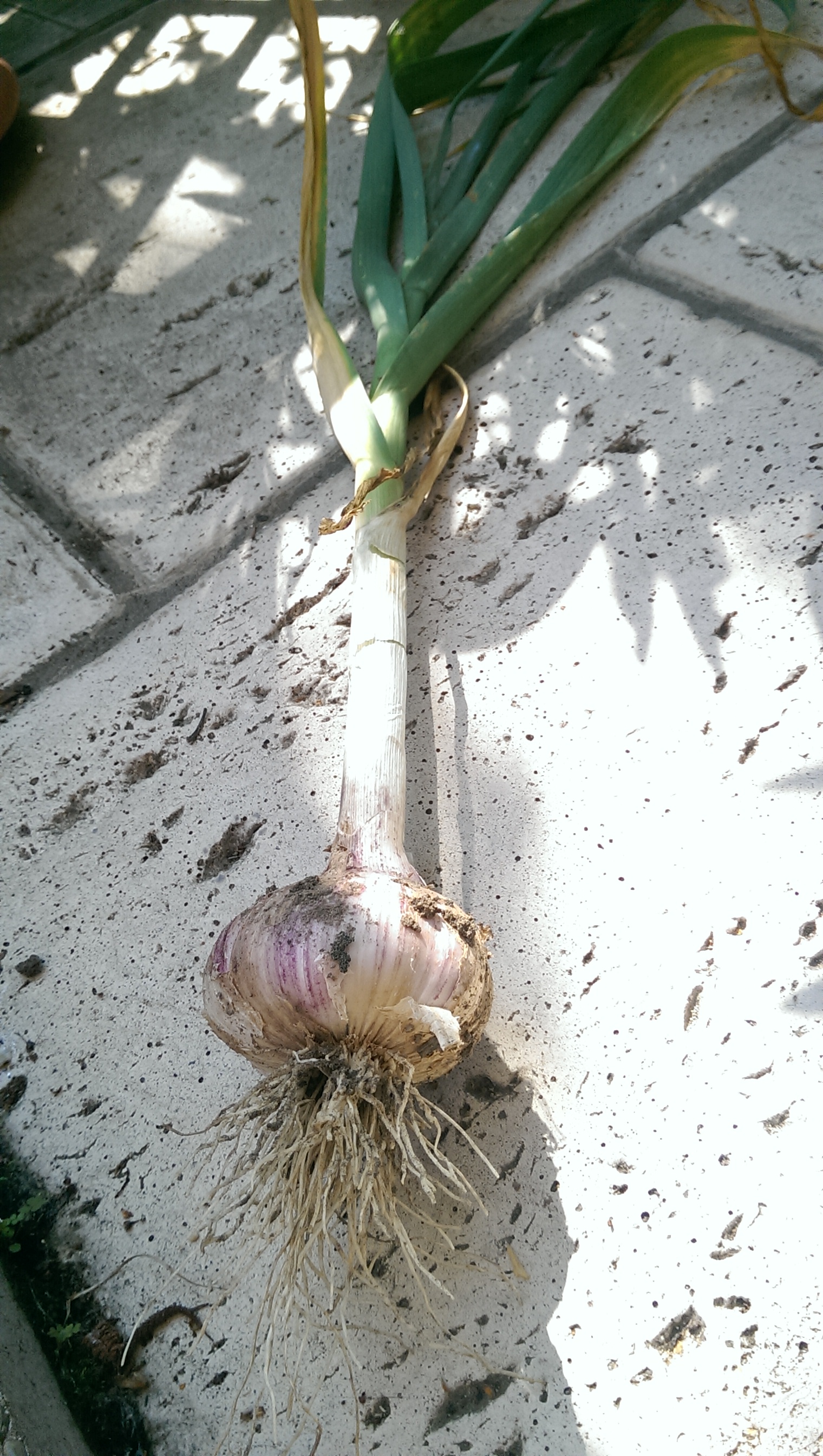 Nachdem ich ein sehr ungeduldiges Ninchen bin, hab ich gestern zum Abendessen kochen eine frische Knoblauchknolle geholt, wenn man diese schnell verarbeitet kann man die ruhig auch schon vorher aus der Erde nehmen. Das selbe gilt auch für die Zwiebel.